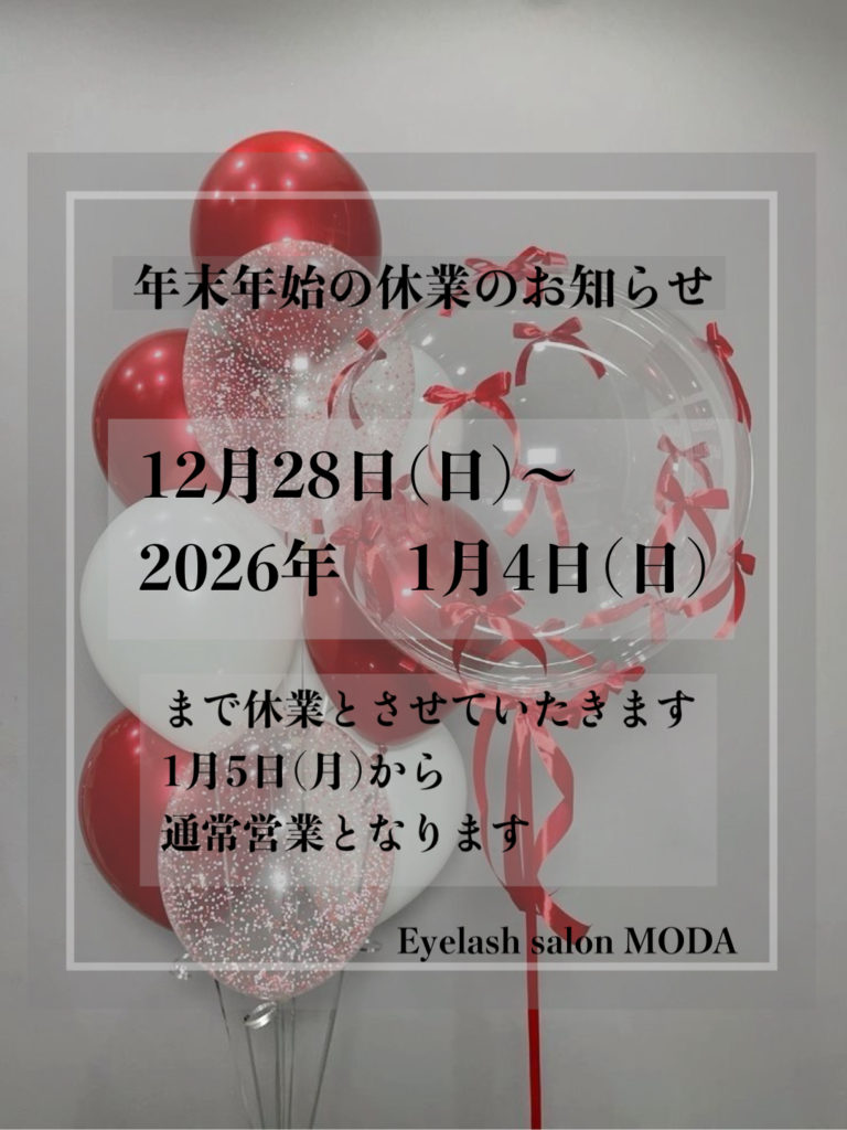 年末年始の休業のお知らせ 2025年11月22日 忘年会、クリスマス、お正月などイベントが多いこの時期にまつげと眉毛を整えませんか? 12月の後半は少しづつ埋まっていますが前半はまだ空きが沢山あります ご予約お待ちしております♡